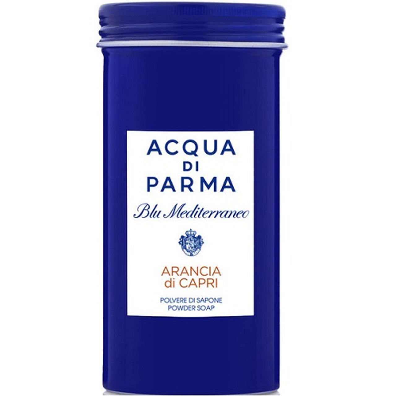 The Acqua di Parma Blu Mediterraneo Arancia di Capri powder soap is a silky powder that transforms into a rich, velvety foam when it comes into contact with water. It gently cleanses the skin, leaving it soft and perfumed with the uplifting, sunny citrus scent of Arancia di Capri, featuring notes of sweet orange, mandarin, lemon, petit grain, cardamom, caramel, and musk. The powder is typically packaged in a classic, elegant metal container reminiscent of old talcum jars.
