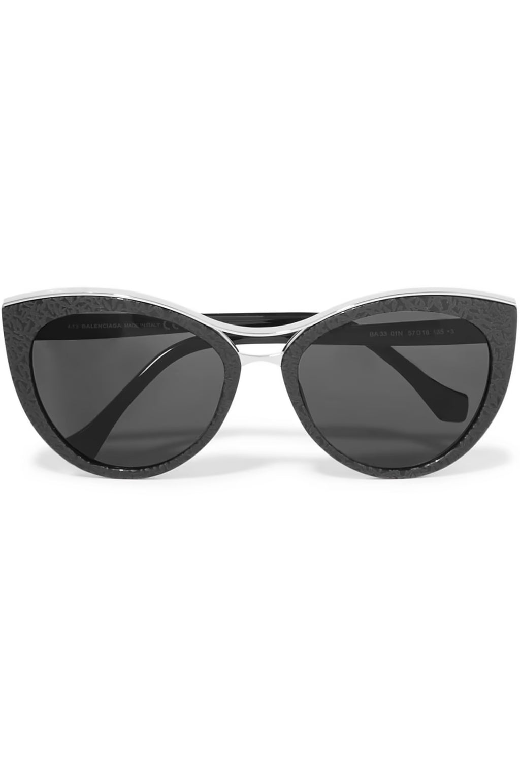 Constructed in shiny black textured acetate frame, this uniquely designed sunglass by Balenciaga features a cat eye cut which instantly creates the most flattering and feminine silhouettes. With subtle green hues in the lenses, this pair is completed with black arms that are etched with the brand name to complete the look.