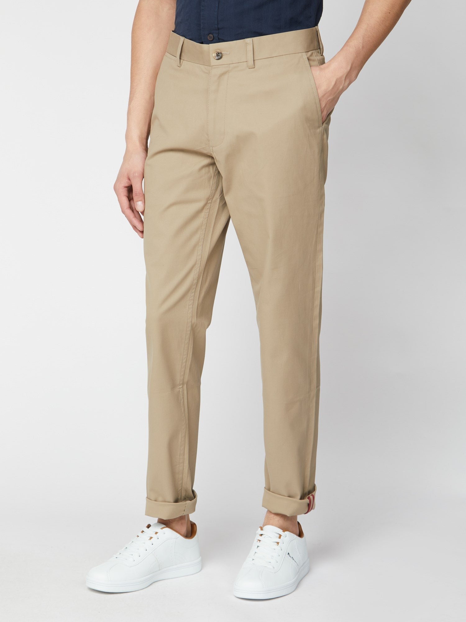 The Ben Sherman straight-legged stretch chinos are constructed from a lightweight cotton stretch fabric for extra comfort and cut in a regular fit for a sleek modern style. Featuring a front coin pocket, concealed zip fly and tape detailing on the turn ups.