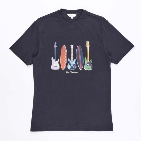 Soft breathable cotton featuring a unique front graphic of surfboards and guitars blending music and beach vibes for a laid-back streetwear look
