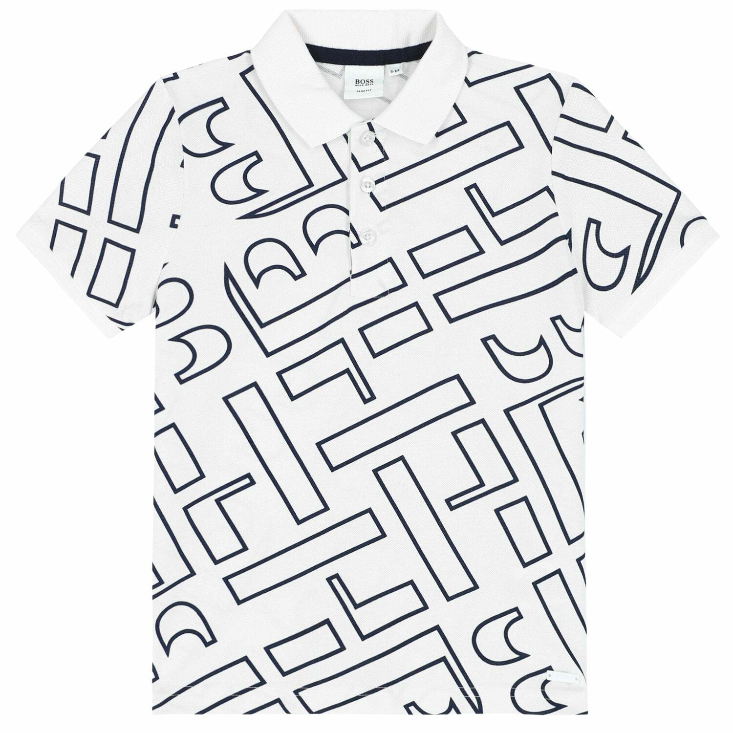 White logo polo shirt for boys by BOSS. Made from soft cotton, it features a allover logo print pattern in navy. Collared with branded buttons to fasten at the neck.