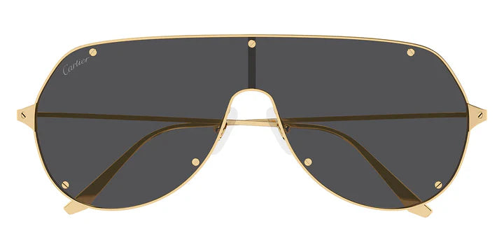 Cartier 0324S 001 sunglasses with smooth and brushed golden finish frame and grey mask lens.