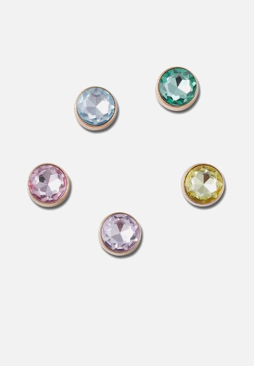 Pop some personality onto your shoes with this Gold and Gem 5 Jibbitz Pack It's the perfect addition to your favorite pairs of clogs, slides, and more.