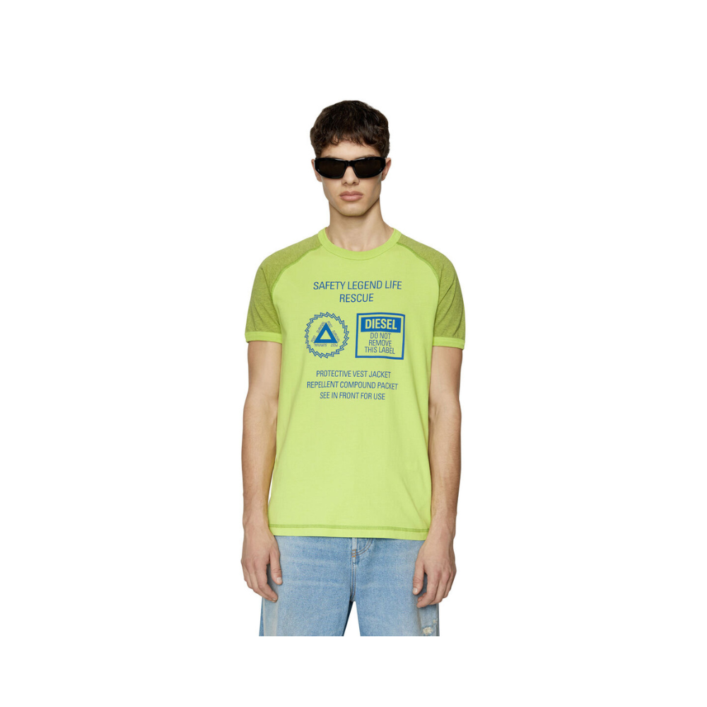 Mens slim-fit T-shirt in cotton jersey, featuring a plain body and mélange raglan sleeves. The finished tee is garment-dyed for a mismatch colour-block effect. Finished with a Diesel safety print on the chest.