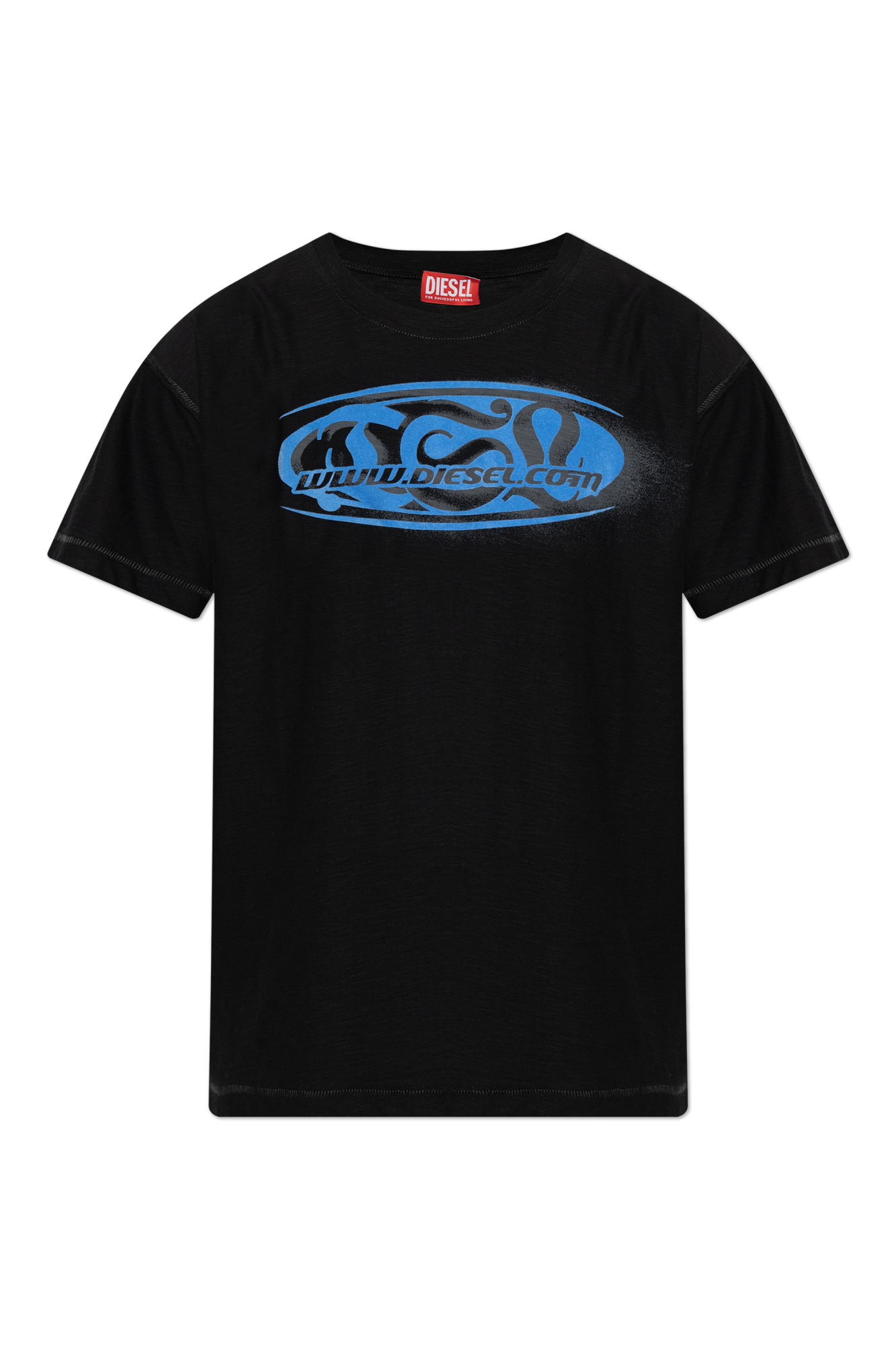 The refined, matte fabric is meticulously selected cotton, typical of exclusive casual collections. The central feature of the composition is an eye-catching, oval "www.diesel.com" print in deep blue, enhanced with creative graphic motifs. The back of the T-shirt is free from any prints, further emphasizing its minimalist style.
