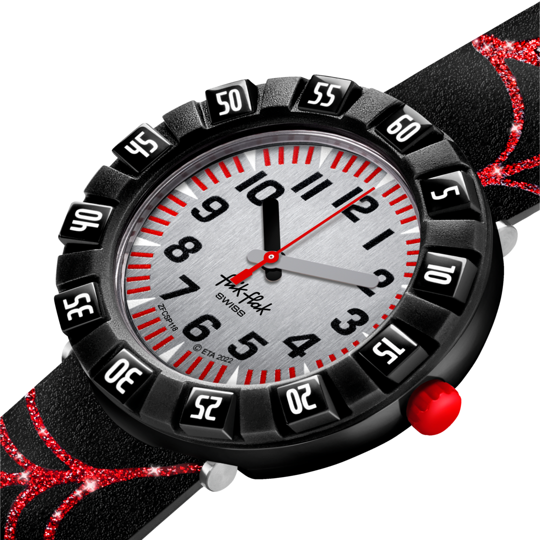 Red spiderwebs are etched on the shiny print strap metallic design of the WEBAXUS kids watch. Kids will learn to tell the time with this educative gift.