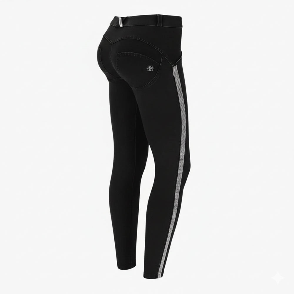 Experience the perfect fusion of comfort and style with the Freddy Women's Ankle Length WR.UP® A-Shaping Jeans in Dark Blue. Crafted to enhance your silhouette, these jeans aren't just clothing—they're your new best accessory. The sleek, dark blue fabric is elevated with a sophisticated rhinestone embellishment, making them a standout piece for any wardrobe. Designed with Freddy's revolutionary WR.UP® technology, these jeans offer unparalleled shaping and support, hugging your curves in all the right places. The ankle-length cut brings a modern touch, ideal for pairing with your favourite heels or casual trainers.