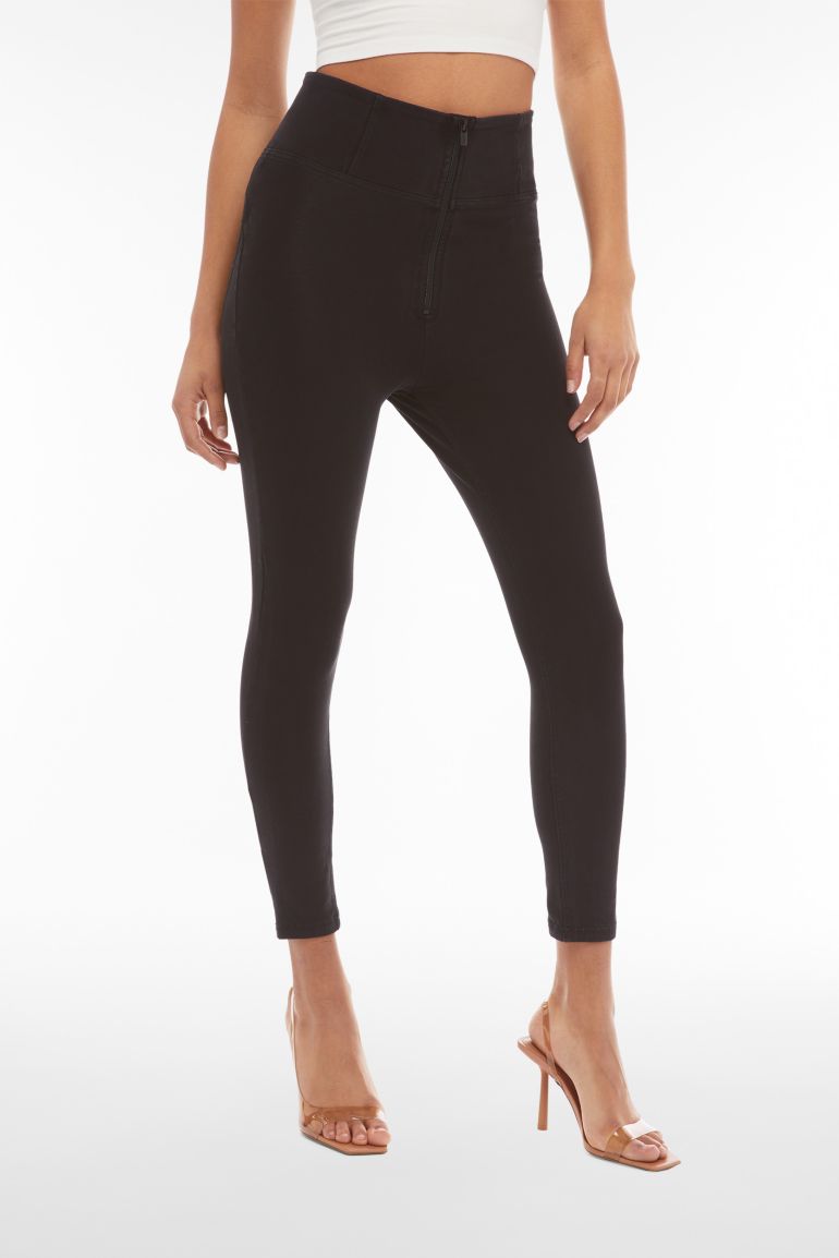 WR.UP® curvy push up trousers with high waist and front zip designed to enhance fuller figures thanks to the easy fit on the waist and hips and superskinny on the rest of the leg. The model has a 7/8 length at the ankle and is in denim-effect stretch jersey produced using organic cotton and recycled elastane: a sustainable choice made by Freddy to enhance your femininity in unison with a love for our planet.
