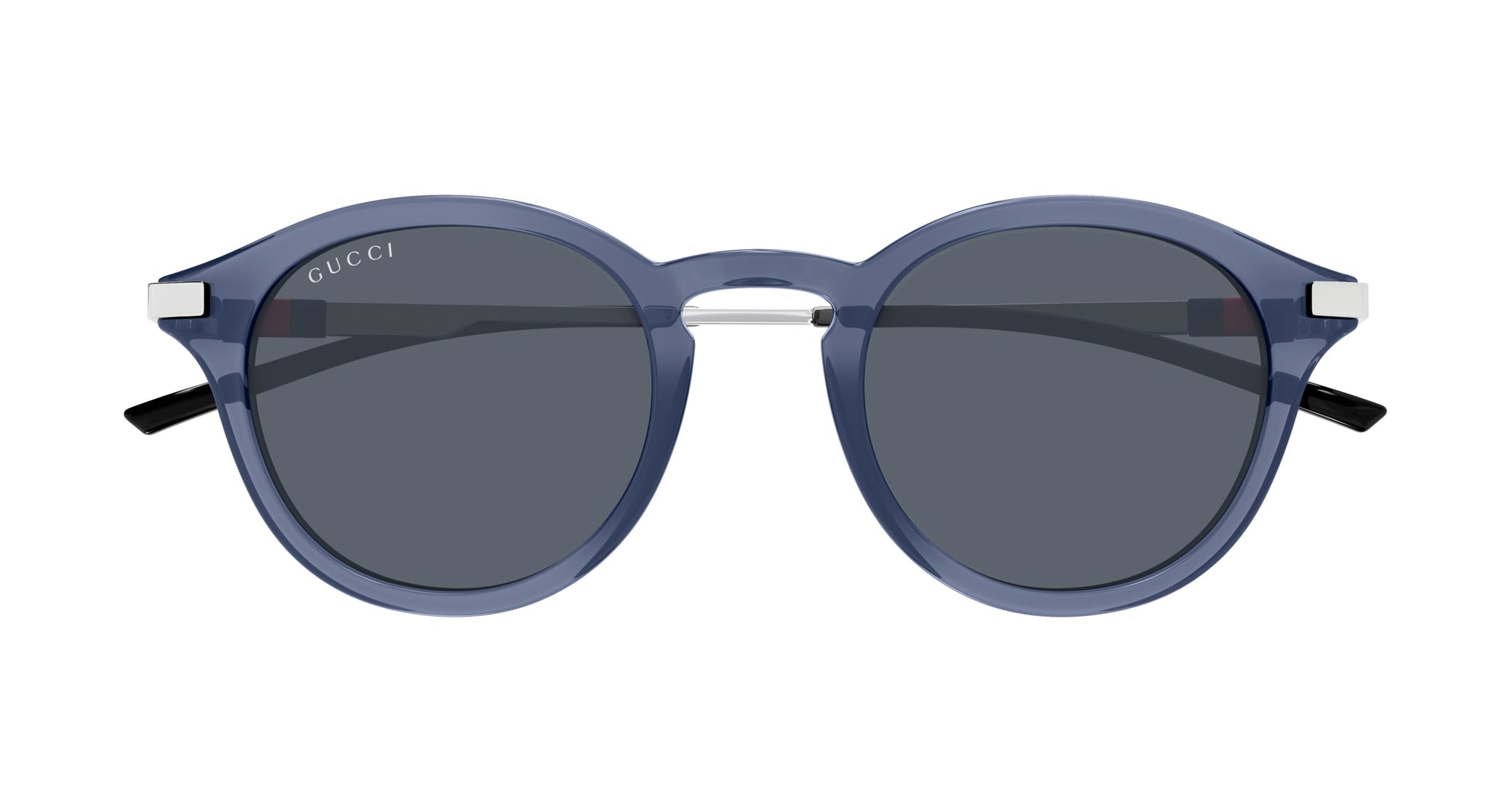 Gucci GG1890S 004 sunglasses for men, featuring shiny transparent inked blue panthos recycled acetate frame and solid grey bio nylon lenses. Brand line: Sign. Style code: GG1890S. Color code: 004. Made in Japan.