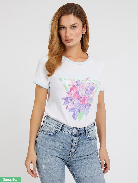This Guess T-shirt is perfect for any casual occasion. Crafted from jersey fabric, it features a crew neck, short sleeves, and a regular fit. The white colour is highlighted by a pink-and-white bouquet print to make a statement.