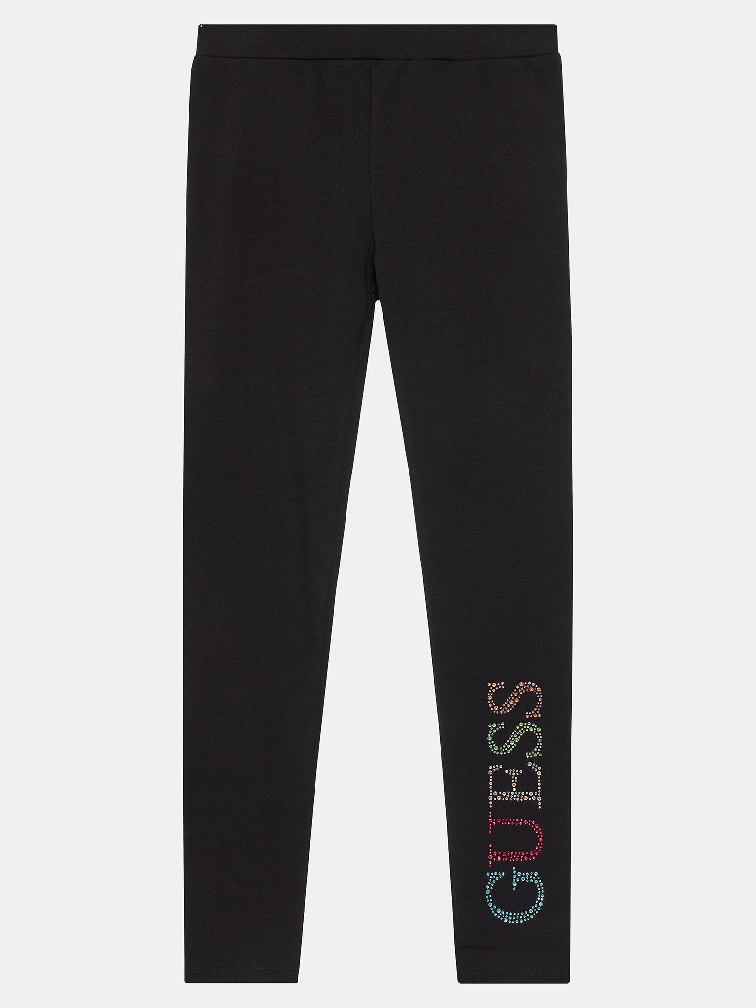 Guess logo decorated with rhinestones on the leg.