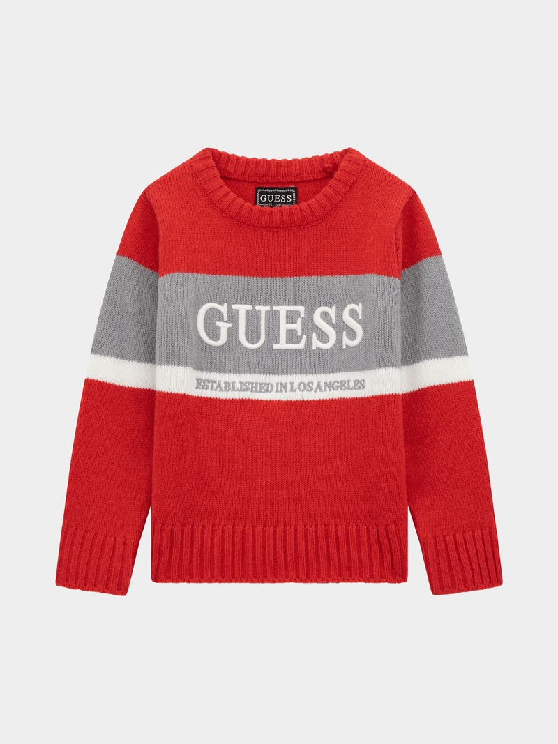 Stay warm and stylish with our Guess long sleeved sweater. Made with 85% acrylic and 15% polyamide/nylon from Bangladesh. Features a round neckline and regular fit for kids aged 2-8 years.