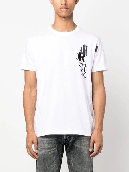 White, cotton, logo print to chest, graphic print to back, logo tab, crew neck, short sleeves and straight hem.