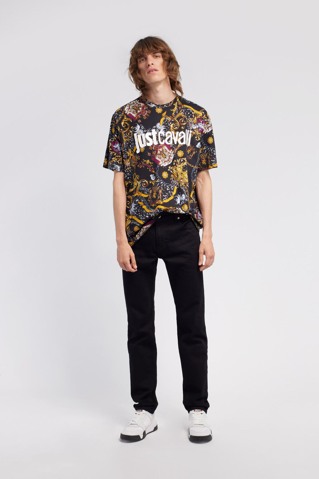 Short-sleeved crewneck T-shirt with an original Just Cavalli baroque-inspired print with royal crests and golden ornaments. Contrasting central logo.