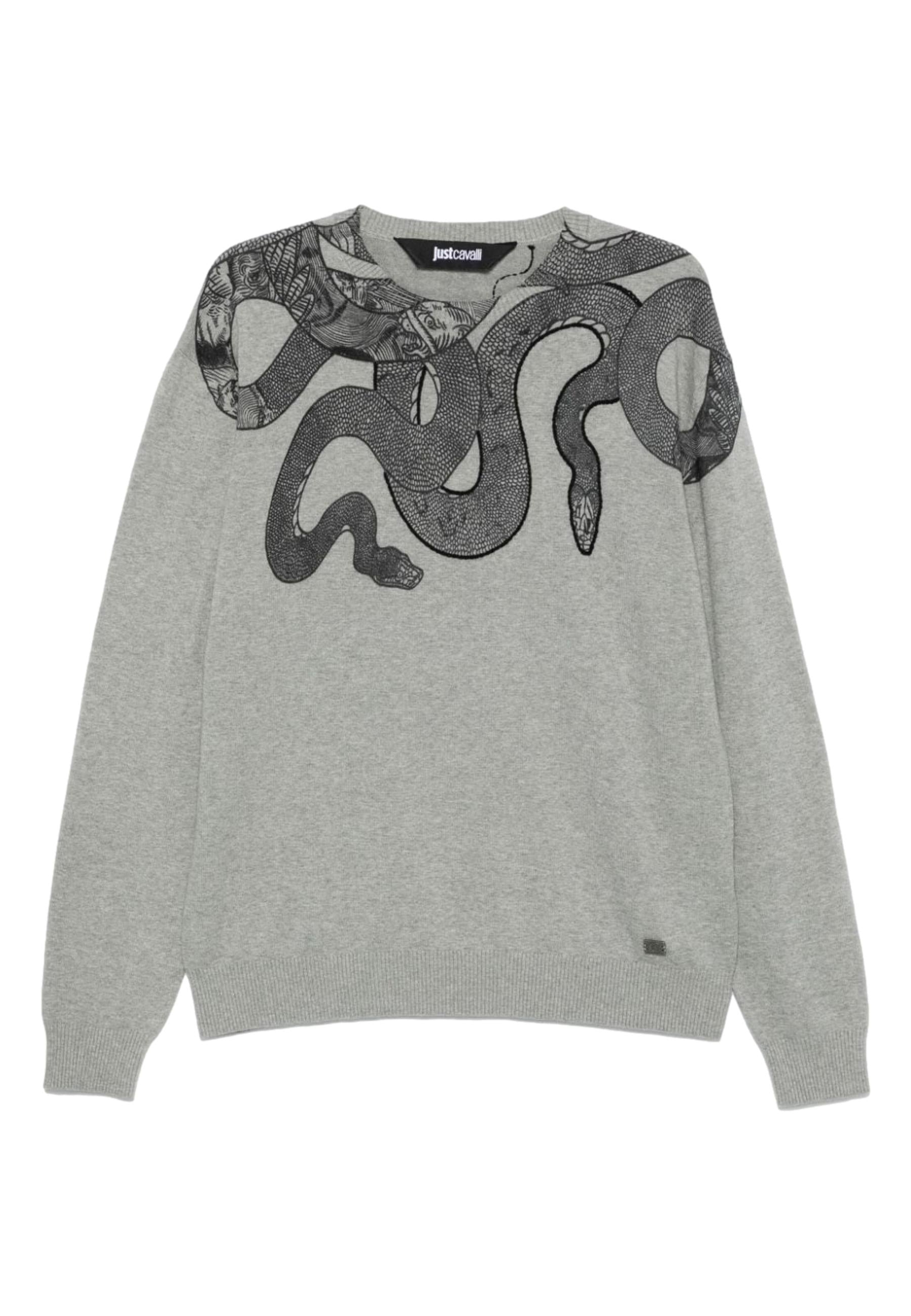 Grey cotton sweatshirt with fine mélange effect ribbed crew-neck with snake print, long sleeves and silver conlogo plaque on the bottom
