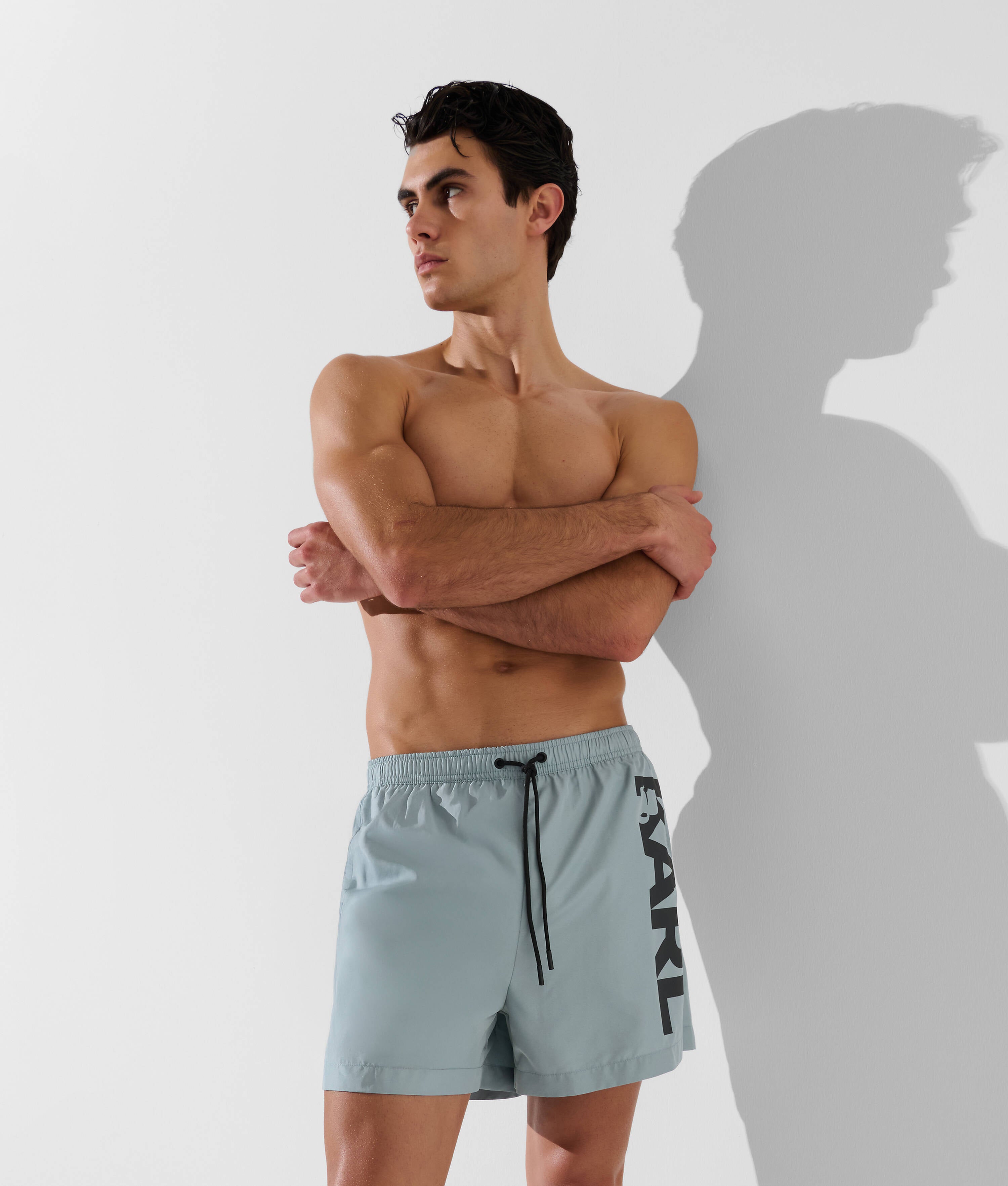 Crafted from woven polyester, these KARL LAGERFELD boardshorts feature a drawstring waist for a personalized fit, inner mesh support, and multiple pockets, accented by a prominent KARL logo on the left leg.