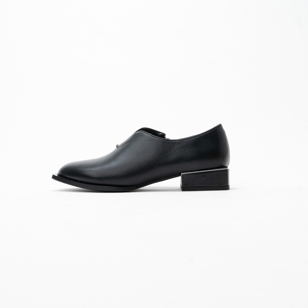 Introducing a sophisticated addition to your footwear collection: the black square-toed loafer shoe. Crafted for both style and comfort, this shoe has a modern twist with its sleek silhouette and versatile design. The square toe adds a contemporary edge, while the block heel provides stability and support for all-day wear. The side zip closure will make slipping into these loafers effortless. With their timeless appeal and easy-to-wear design, these black square-toed loafers are sure to become a staple in your wardrobe.