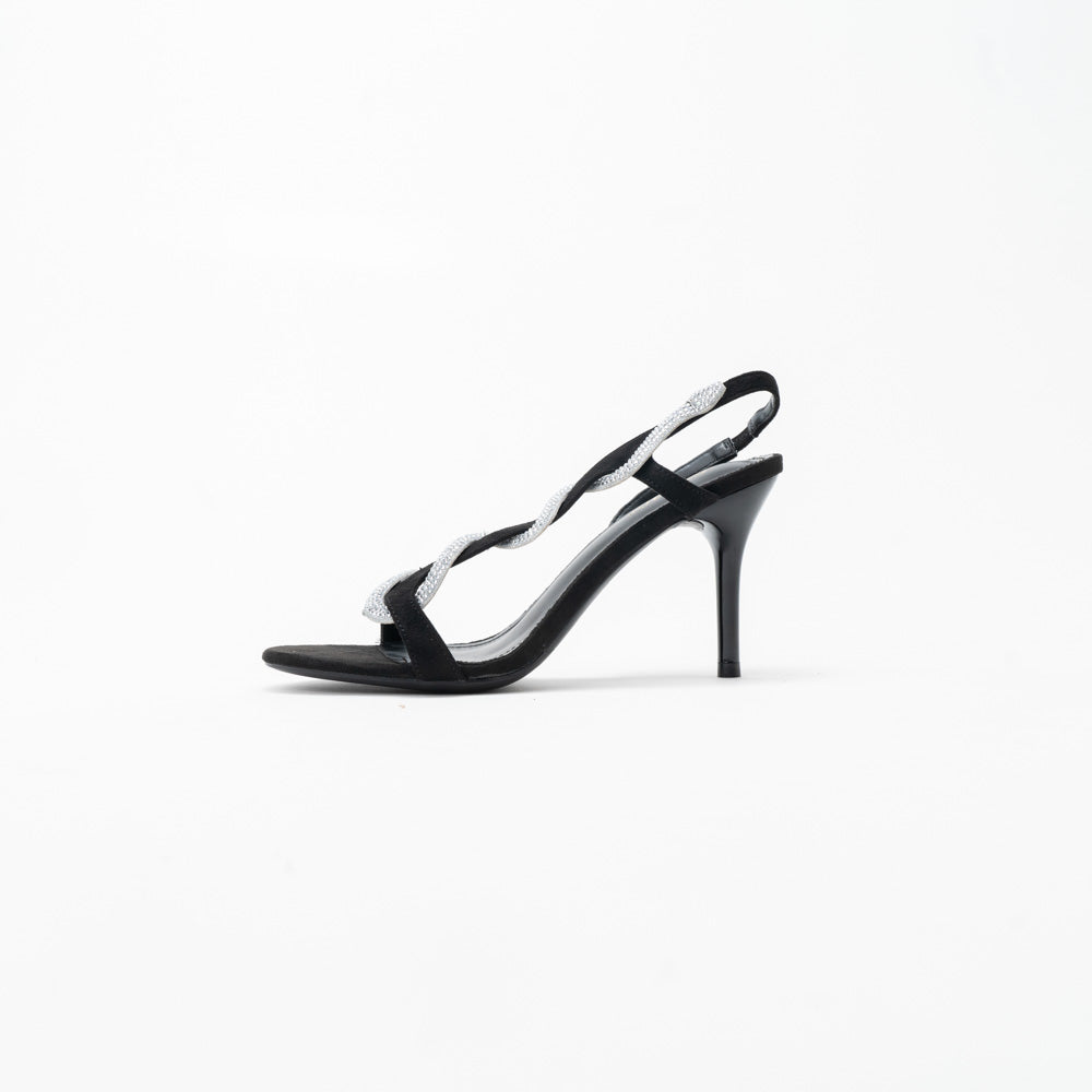 Indulge in unparalleled sophistication with these stunning black heels, crafted from luxurious faux suede and adorned with silver twirled diamante straps. Elevating your look with both height and allure, these sandals are a must-have for any fashion-forward wardrobe. The faux suede material exudes elegance, while the intricate diamante detailing adds a touch of glamour and sparkle to every step you take. Whether you’re dressing up for a formal event or adding a touch of sophistication to your everyday ensemble, these heels are sure to make a statement and turn heads wherever you go.