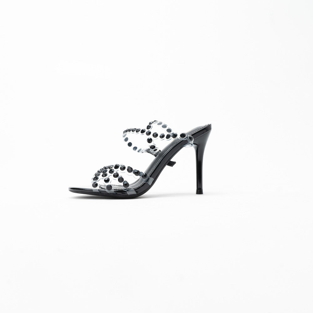tep into the spotlight with LaHer’s black studded heels, creating an illusion of floating feet. Featuring translucent straps adorned with black studs, these stiletto sandals are destined to captivate attention and spark conversations wherever you go.