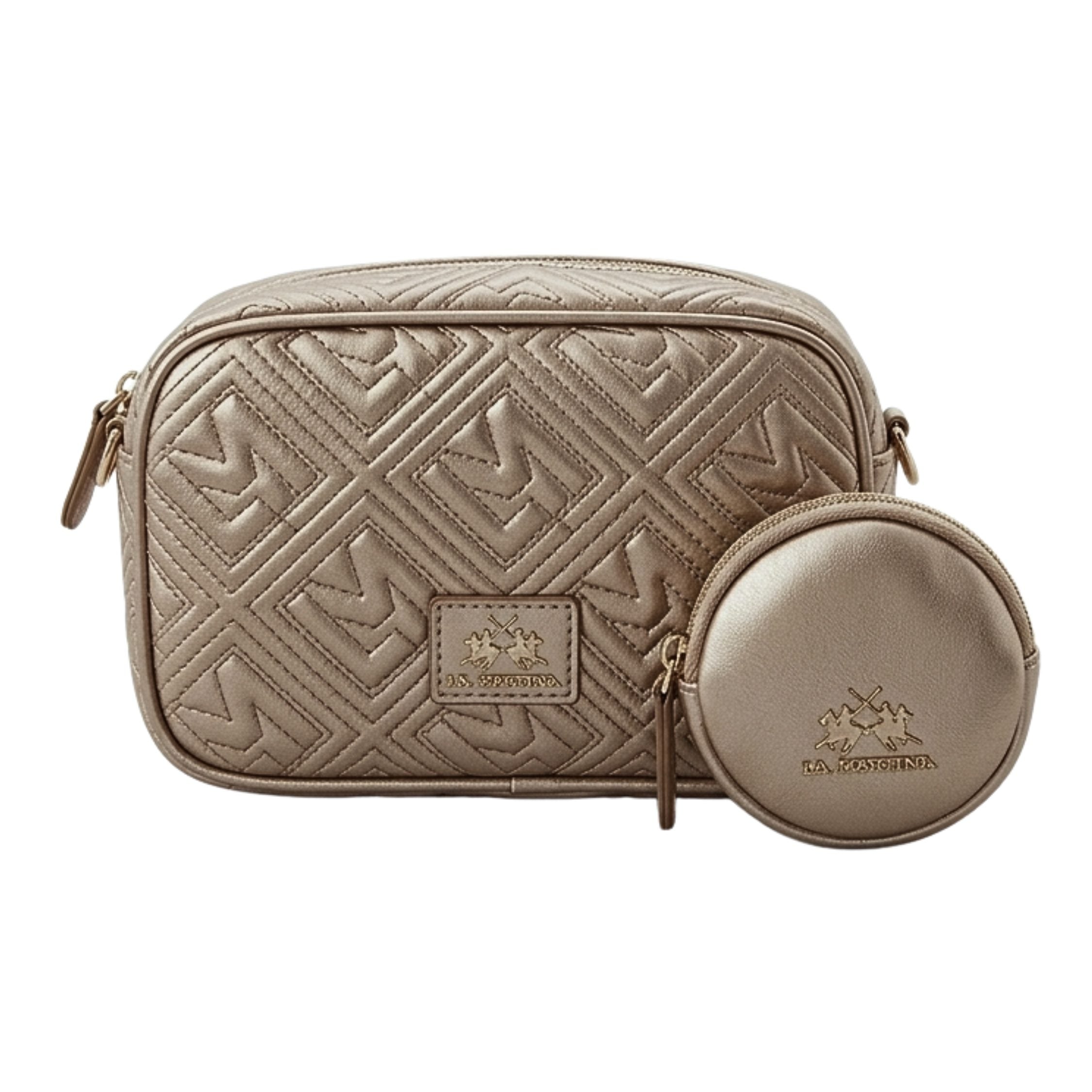 This bag is made of faux leather and features a detachable, adjustable shoulder strap with carabiners. Features include one zipped compartment, one zipped pocket inside, one open pocket, gold hardware, and a wallet included.