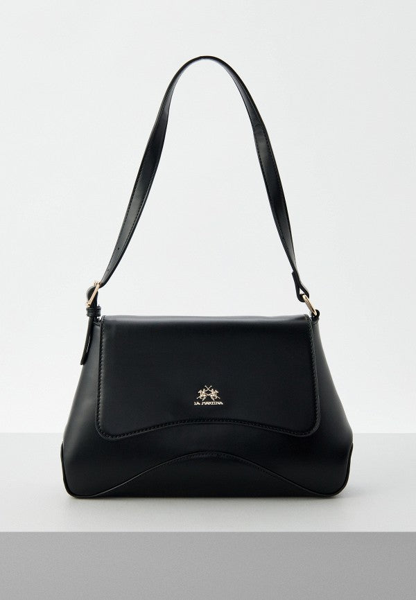 This premium brand bag is made of faux leather. Features include a flap closure with a magnetic snap, one compartment, one zipped pocket and one open pocket inside, one zipped pocket on the back, and an adjustable shoulder strap.