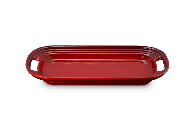 The stoneware platter features ridged edges that slope upward to contain food, while two wide handles are cut into each end to ensure a steady grip when carrying heavier foods like roasts or poultry from oven to table. Crafted from premium stoneware in our irresistible colours, the serving platters are part of our tableware collection and finished with a vibrant glaze which is easy to clean, dishwasher-safe, and resistant to chips, scratches and stains.