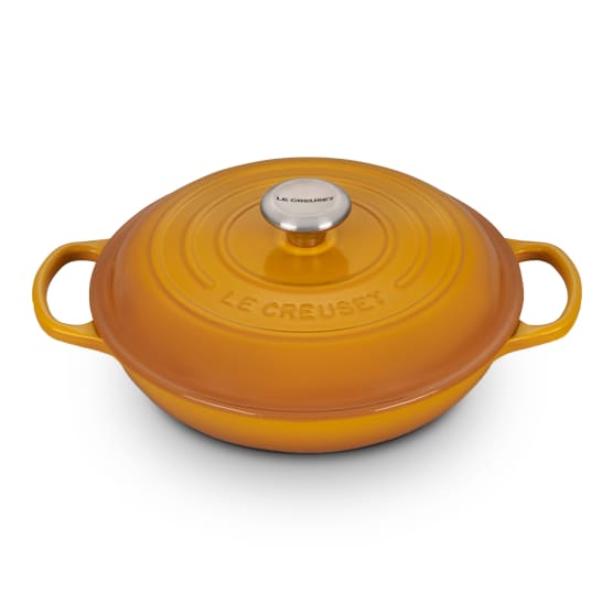 This 2L Shallow Enamelled Cast Iron Casserole enhances the cooking process by evenly distributing heat and locking in the optimal amount of moisture. With ergonomic handles and advanced interior enamel that resists chipping and cleans easily, Le Creuset’s Signature Shallow Casserole blends the best of the past with the latest innovations in comfort and functionality. Most braising recipes call for searing the meats or vegetables at a high temperature, then finishing covered on lower heat, creating a natural gravy. These family-sized casseroles are perfect for stews with both meats and vegetables.