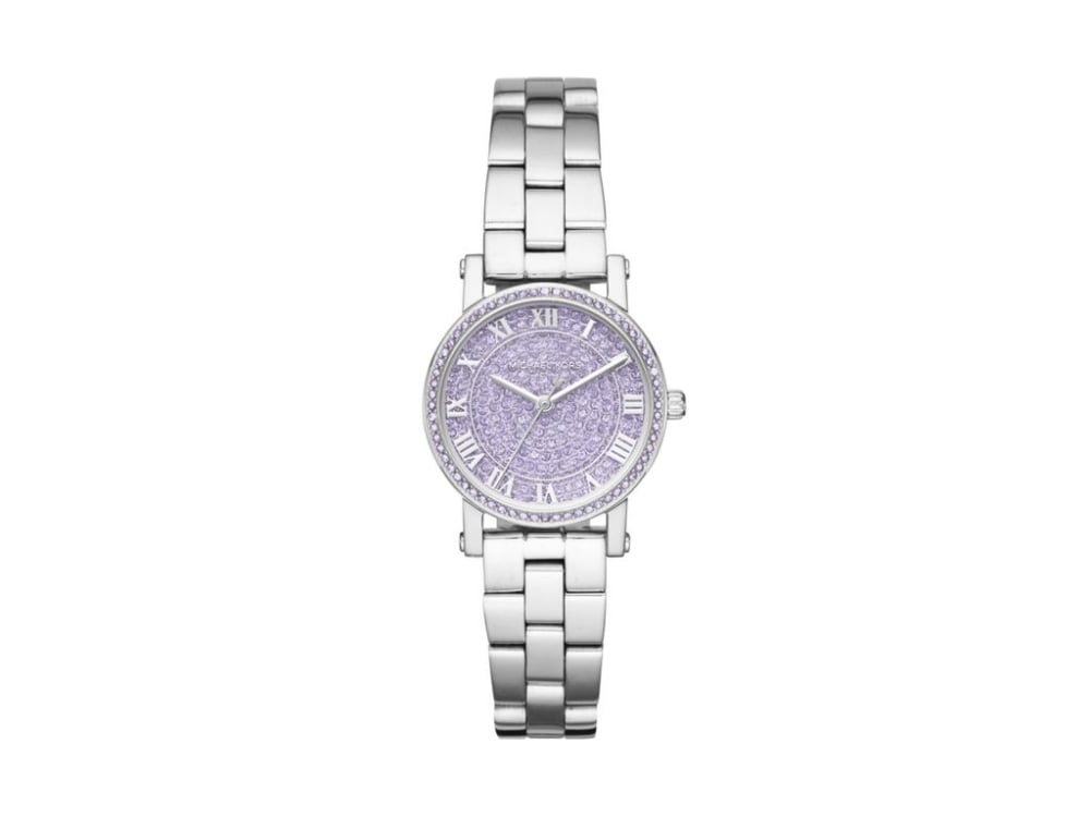 A sleek stainless-steel case, chic lavender pavé-covered dial with Roman numeral indexes and a 3-link stainless-steel bracelet create a look thats perfect for her.