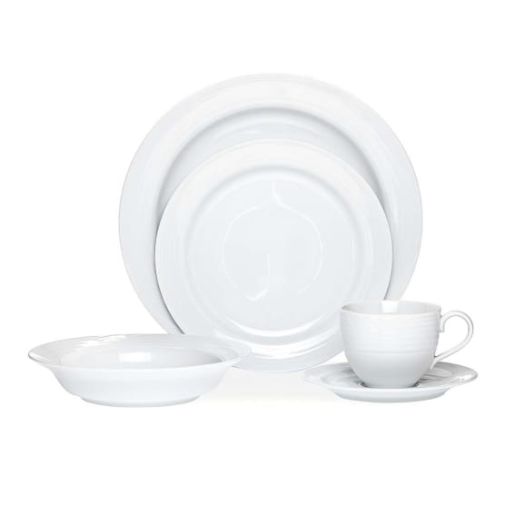 Contemporary design in white with a subtle circular embossed rim on a fine white porcelain body. Arctic White is a stylish pattern that is versatile enough be used as a casual breakfast setting or can just as easily be dressed up for formal dining.