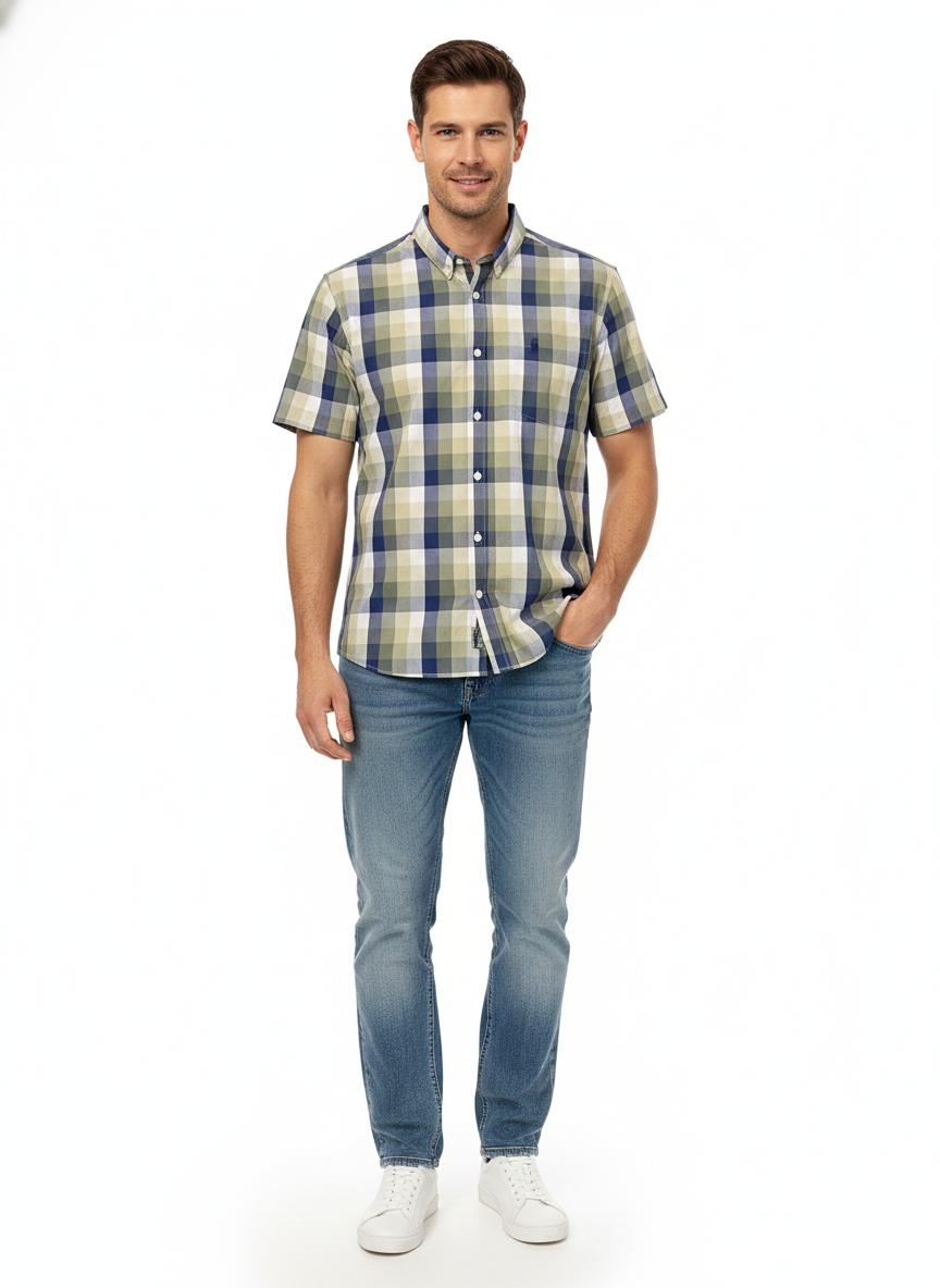 Polo Men's Dobby Shirt in Blue. Elevate your look with the subtle, sophisticated geometric texture of this sharp blue shirt. Classic fit and iconic Polo style, perfect for smart-casual wear.
