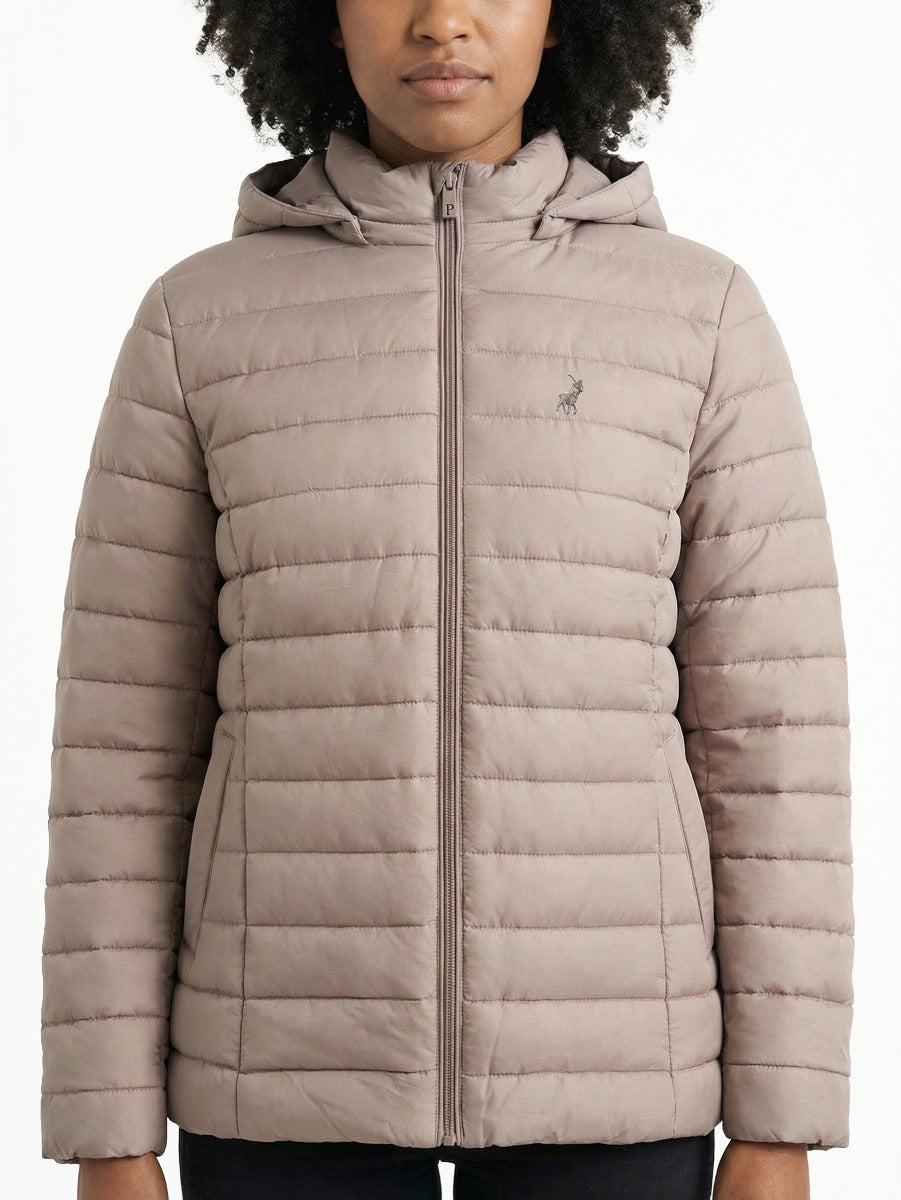 A quilted, insulated jacket designed for warmth in cold weather.