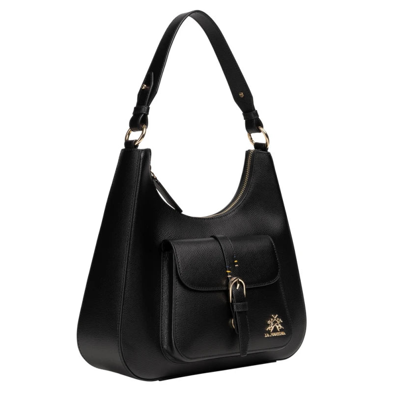 Womens handbag with an unusual appearance. A combination of premium quality smooth leather and gold colored metal details and brand logo. One longer fixed ear, external, separate compartment with a clasp for storing smaller items and a practically designed interior. This luxurious accessory will perfectly complement your elegant outfit.