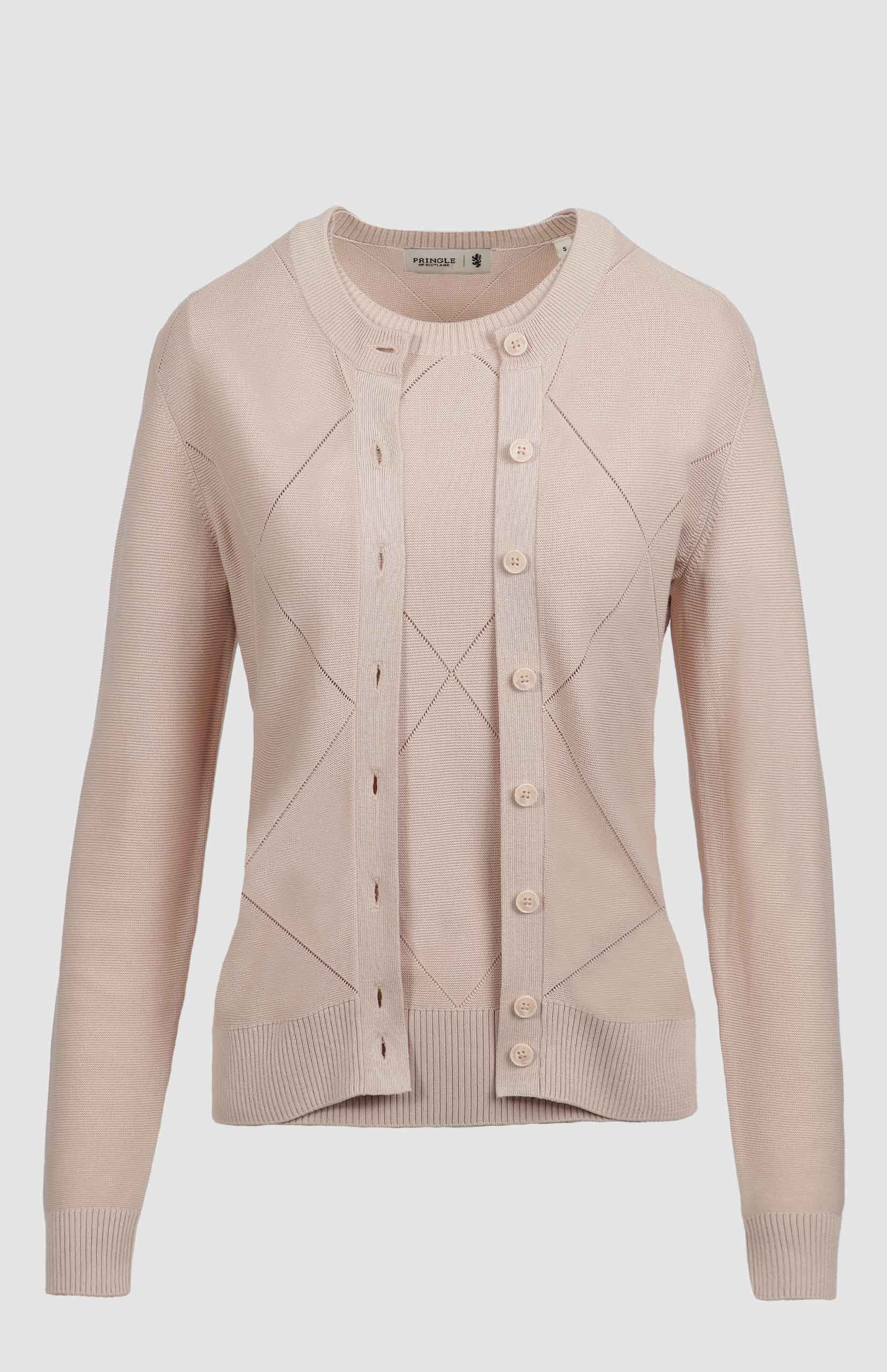 The Pringle Claire Knitwear Cardigan, designed as part of a twin set with the Pringle Claire Knitwear Top, exudes timeless elegance and versatility. Crafted in a delicate dusty pink hue, this cardigan complements its matching top for a coordinated ensemble or serves as a standalone statement piece. Featuring a classic long-sleeve design with a button-up front, the cardigan showcases an open-knit argyle pattern, adding a refined touch of texture. A matte silver ingot on the left-hand side hem subtly highlights Pringle’s iconic branding, elevating its sophisticated appeal.