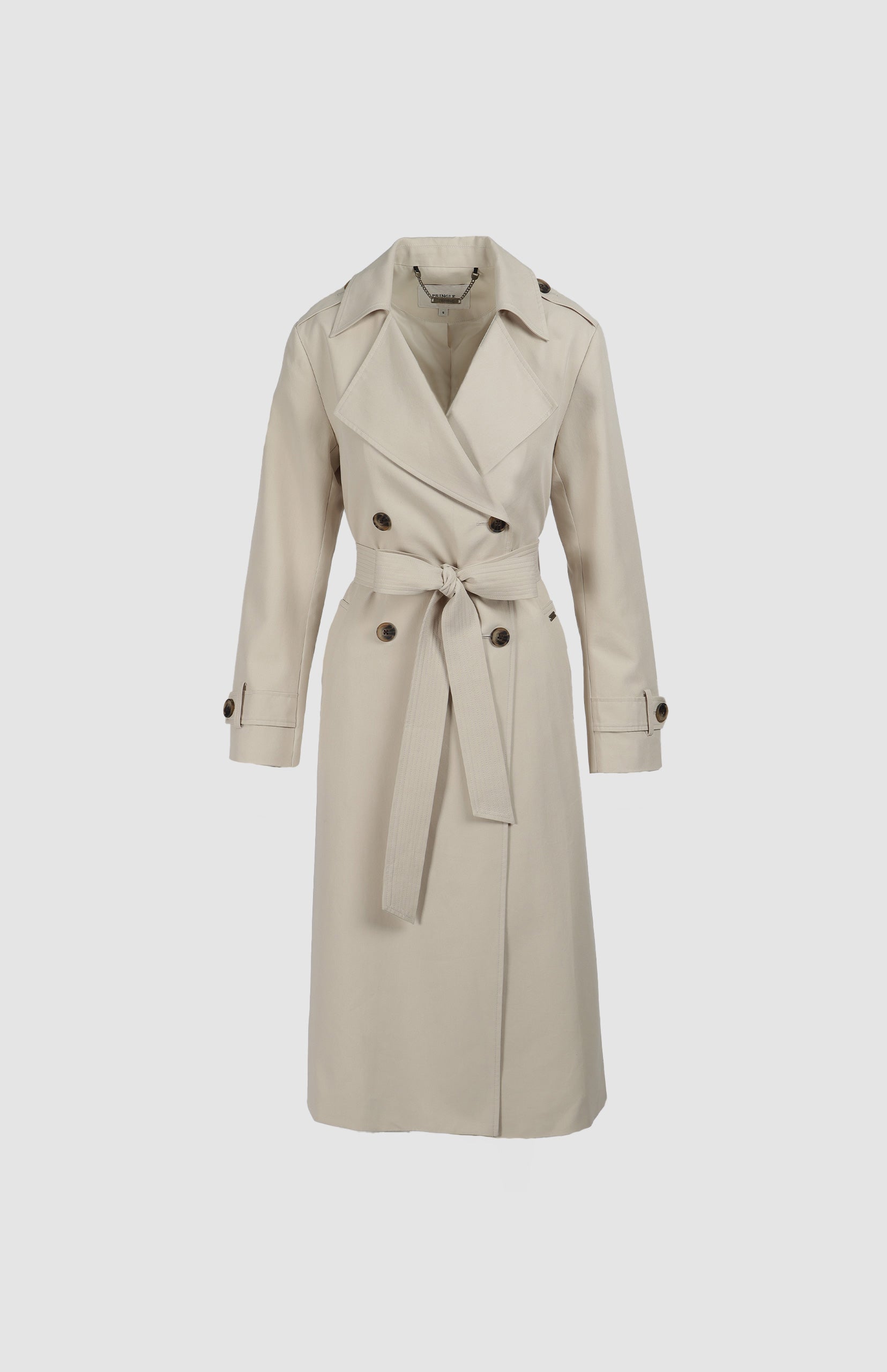 Elevate your outerwear collection with the Pringle Jenna Trench Coat, a sophisticated and versatile piece designed for timeless style and practicality. Crafted in a classic stone hue, this trench coat combines elegance with functionality. Made from a luxurious blend of Cotton and Tencel, it features an anti-wrinkle finish for effortless maintenance. Tortoiseshell buttons add a refined touch, while the back flap and waist tie belt enhance its tailored silhouette. A Pringle ingot positioned below the left-hand side pocket adds a signature branding detail. Perfect for layering over both casual and formal ensembles, the Pringle Jenna Trench Coat is an essential for any modern wardrobe.