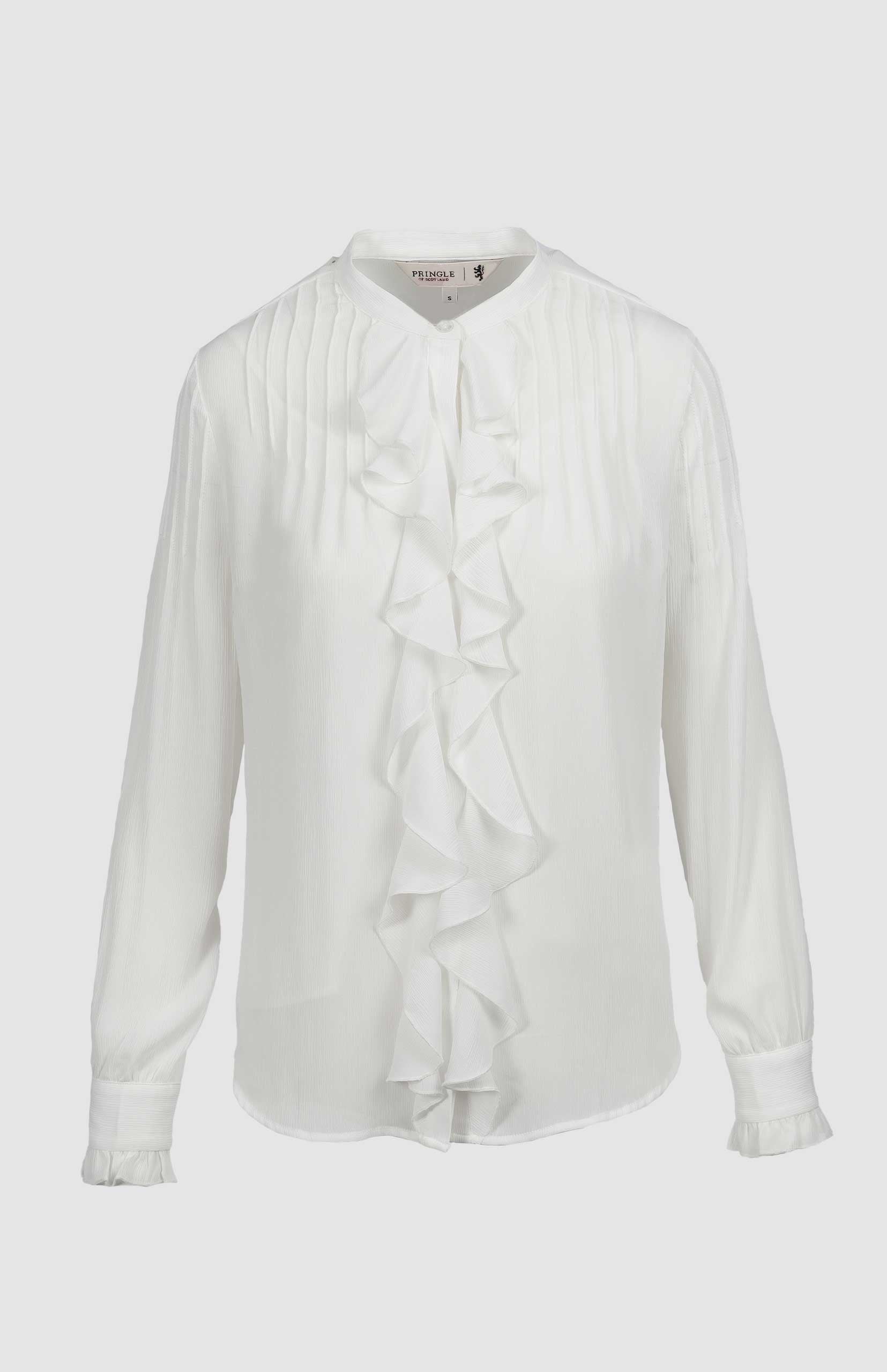 The Pringle Celia Ruffle Blouse is a statement piece crafted from delicate crinkle chiffon, offering a refined yet contemporary look. This long-sleeved blouse features intricate tuks along the yoke, extending down to the chest and along the upper sleeves, adding texture and elegance. Cascading ruffles run from the neckline to the hem, creating a graceful, flowing silhouette. Finished with the signature Pringle metal ingot at the left hemline, this blouse is perfect for adding a touch of effortless charm to your wardrobe.