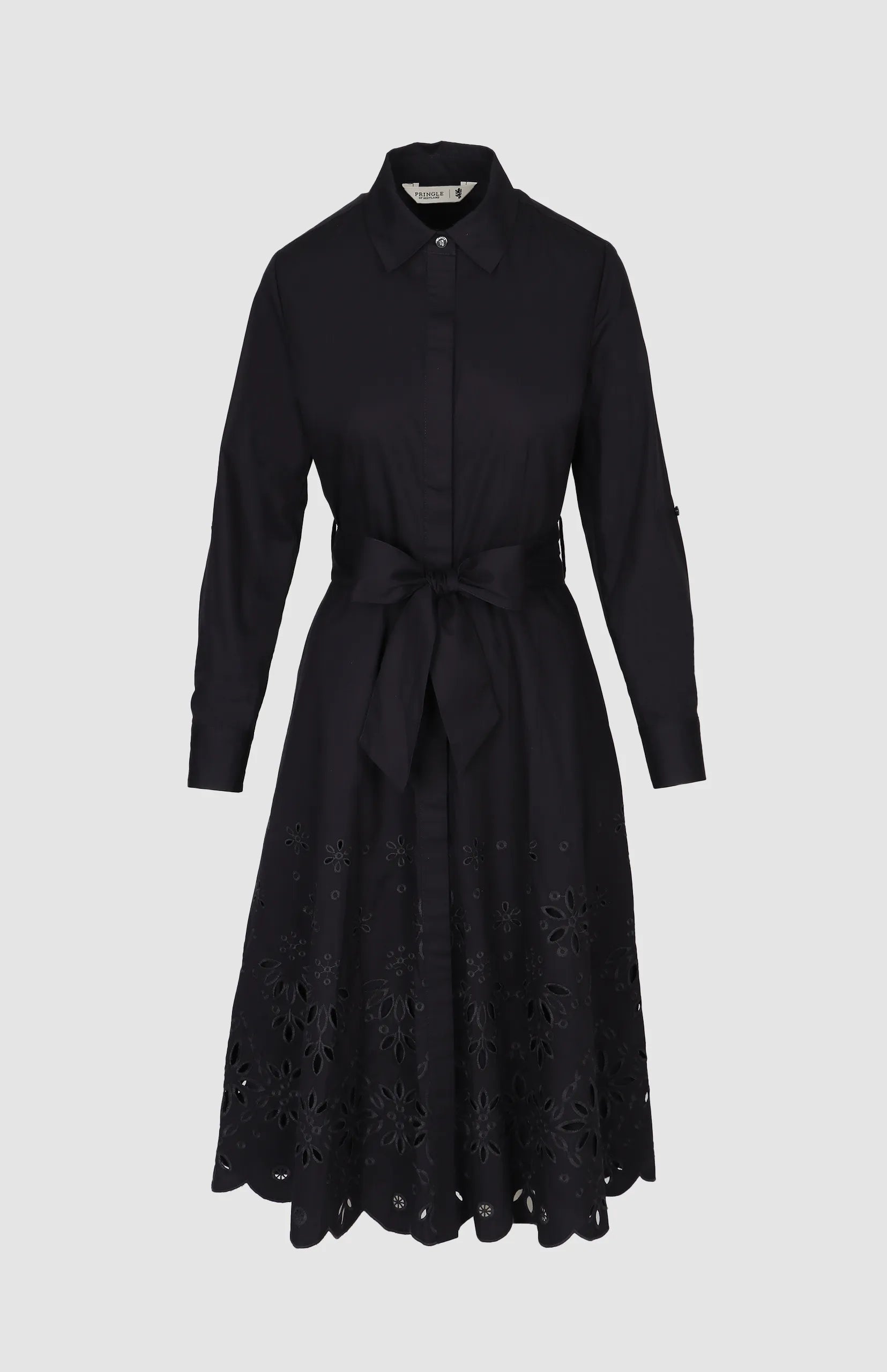 The Lyla Anglaise Shirt Dress blends classic shirting with delicate feminine detailing. Crafted from 100% cotton, it offers breathable structure and a refined finish. The button-through front and sharp collar bring tailored polish, while the self-tie belt cinches the waist for a flattering silhouette. Its standout feature is the intricate floral anglaise embroidery that enriches the hemline, adding depth, texture, and timeless elegance. Perfect for elevated daytime wear or understated occasion dressing.