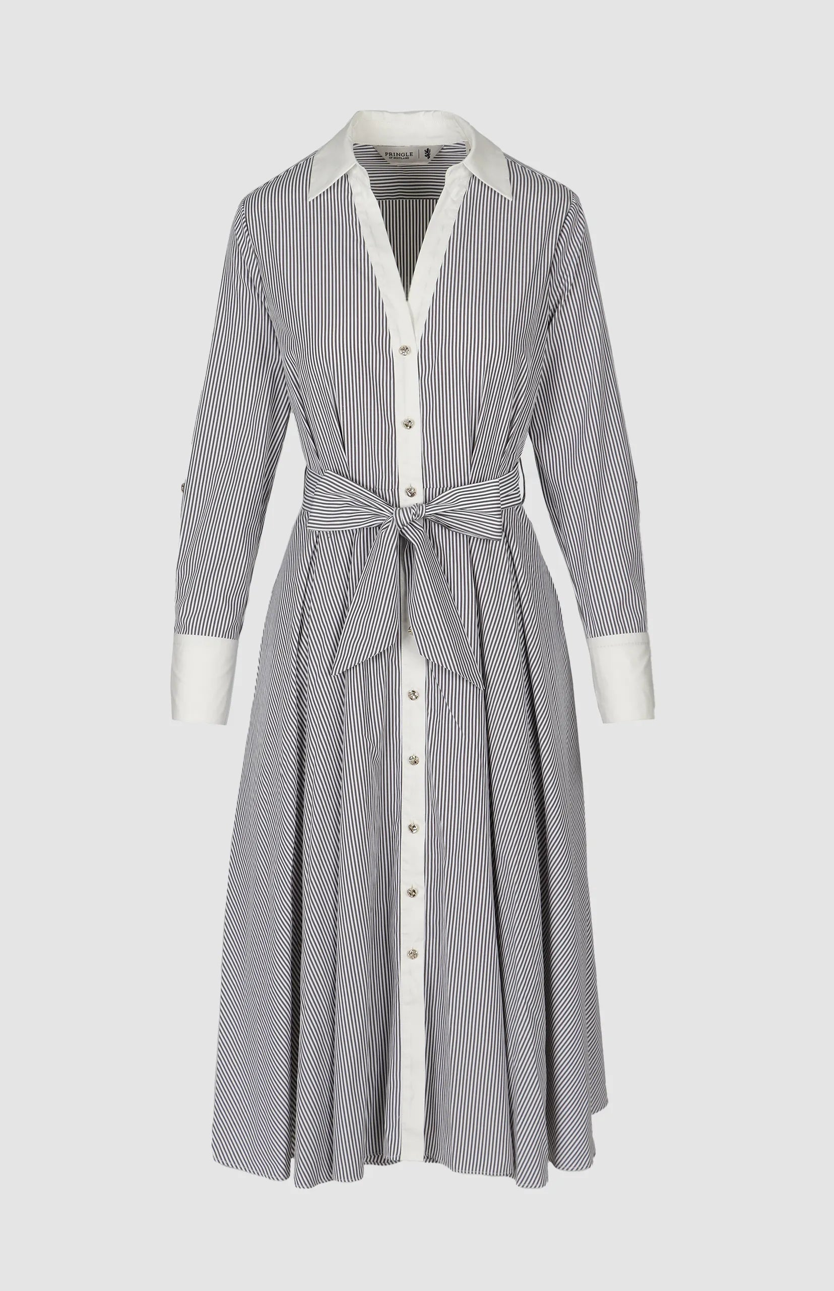 The April Stripe Shirt Dress offers modern polish with a timeless shirting influence. Designed in a classic black-and-white stripe, it features a flattering fit-and-flare silhouette that shapes the waist and creates gentle movement through the skirt. Gold-button detailing adds understated luxury, while the unlined construction keeps the dress lightweight and breathable. Perfect for office wear, elevated daytime outings, or transitional seasonal styling.