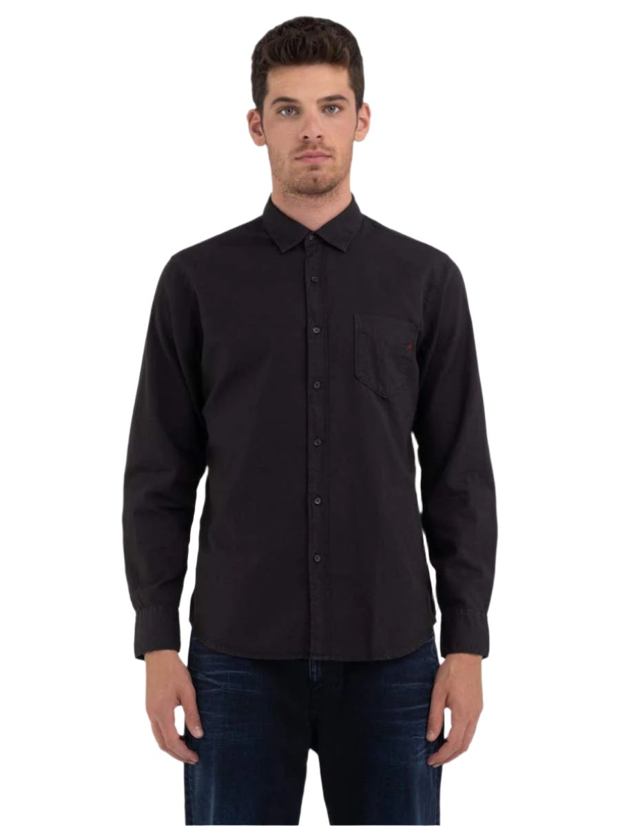 Shirt with regular fit made of garment-dyed oxford cotton with striped pattern. The long-sleeved garment is enhanced by the pocket with R-shaped embroidery on the chest and by the fastening with buttons.