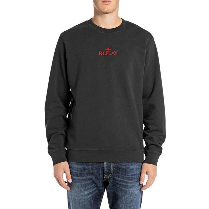 The Replay Logo Crew Neck Sweatshirt in black color is suitable for men and is a sweatshirt with a collar in a round neckline. The front of the sweatshirt features the logo of the company Replay, adding a stylish element. It is a comfortable and stylish choice for any man looking for casual clothing with character.