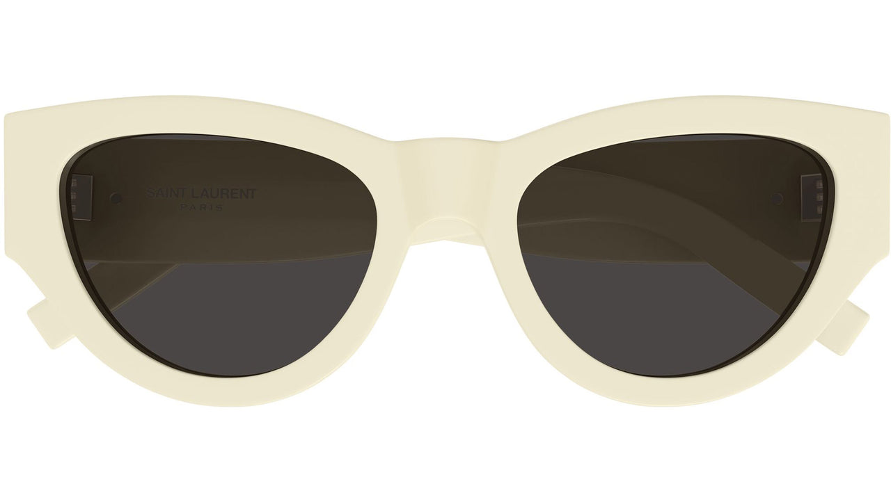 Saint Laurent SL M94 012 sunglasses for women, featuring shiny solid ivory cat eye acetate frame and solid black bio nylon lenses. Brand line: Monogram. Style code: SL M94. Color code: 012. Made in Italy. Authorized Saint Laurent online reseller. Your glasses will include the original case and accessories and are covered by a 12-month global warranty.