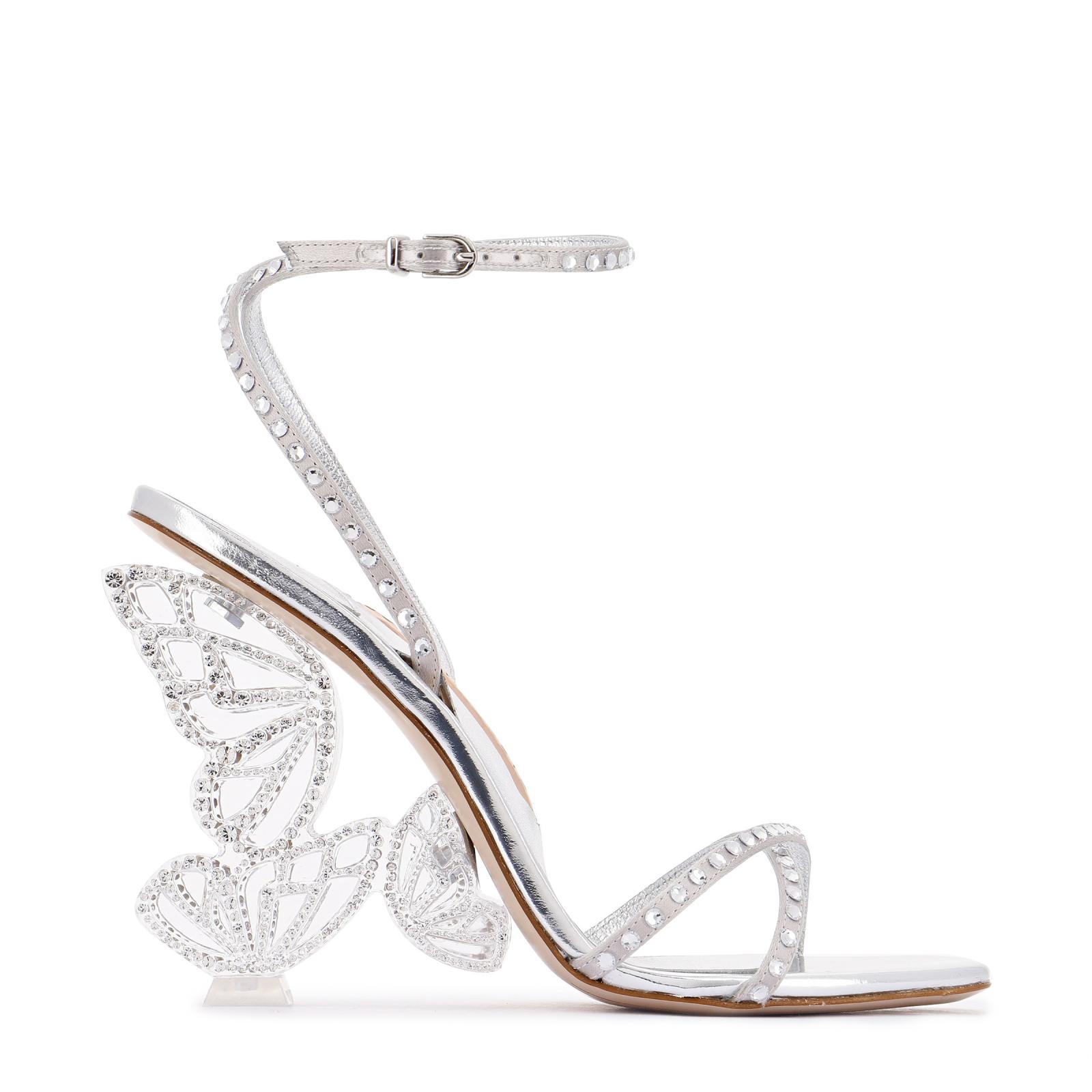 Paloma has had a makeover this season! With a transparent plexi wedge heel crafted in the shape of layered butterfly wings, this wedge has a simple strapped upper adorned with crystals from ankle to toe.
