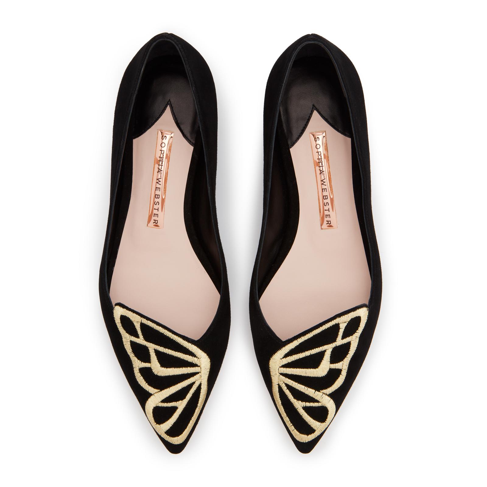 We have updated our signature flats this season in our intricate new print, midnight butterfly meadow! Our updated butterfly wing design covers the toe and is paired with a gold chrome heel. Finished with a padded sock for ultimate comfort!