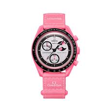 Celebrating April's Pink Moon, this chronograph features a pink Bioceramic case, crown and pushers as well as a pink VELCRO® strap with contrasting white stitching and a pink Bioceramic attachment loop. It features a black and silver-pink opaline dial, complemented by hour markers and black hands coated with pink Grade A Super-LumiNova® (pink emission). Its black Bioceramic bezel features a pulsometer scale with white opaline markers. This model stands out with its moon phase function, arguably the most poetic of all watch complications. Two pink moons rest against a black moon phase disc, which rotates in the subdial set at 2 o’clock. Under UV light, a secret detail appears on the moon phase mask. The battery cover showcases a moon in a stunning array of pink shades. All dials in the collection carry the OMEGA X Swatch branding, the iconic Speedmaster logo and the MoonSwatch logo. The box-shaped biosourced glass construction, the etched "S" in the center of the glass referencing the Swatch logo, the fine and sophisticated circular pattern on the dial's outer ring and the recessed subdials, the sharp and smooth lugs construction and of course the unique Bioceramic feel are common to all models. The indexes, hour and minute hands and chronograph seconds hand sport Grade A Super-LumiNova® (pink emission) for a perfect glow in the dark.