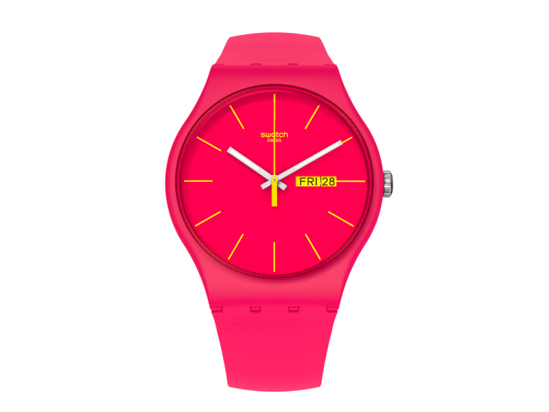 Dial: Pink dial with silver hands and yellow indexes; date display at 3 oclock