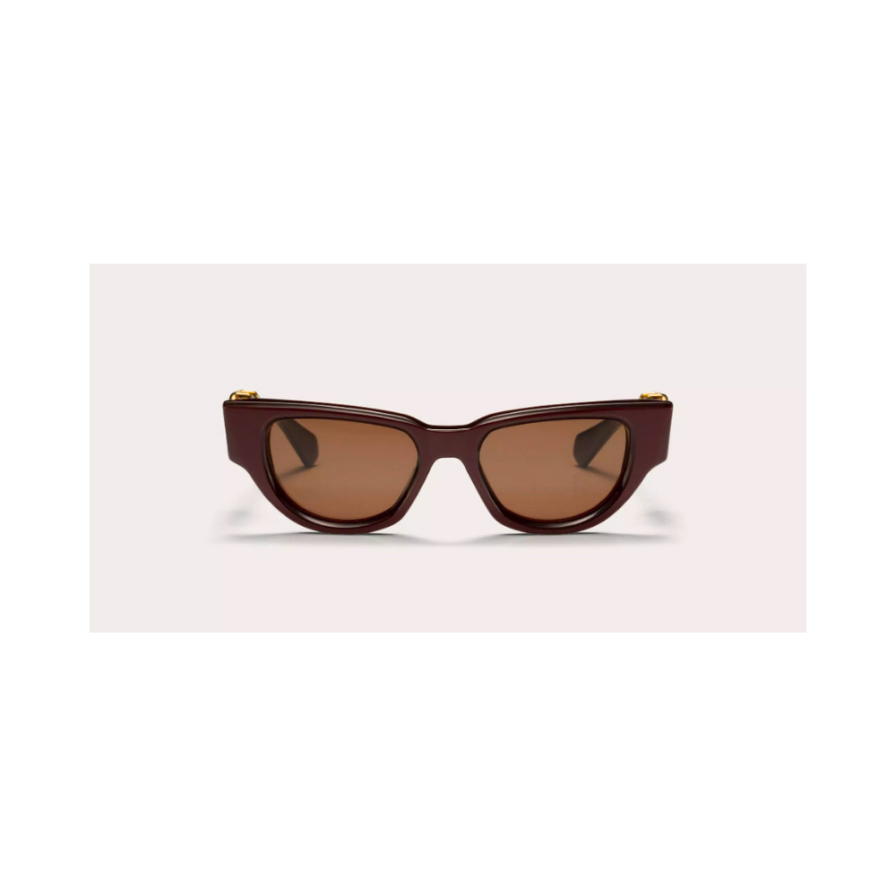 Maroon sunglasses from Valentino Eyewear. Made of Japanese acetate, this pair features cat-eye frames, temples with gold-tone VLogo titanium removable buckle and brown gradient lenses with 100% UV protection. Handcrafted in Japan. Comes with a recycled leather case with strap and cleaning cloth.