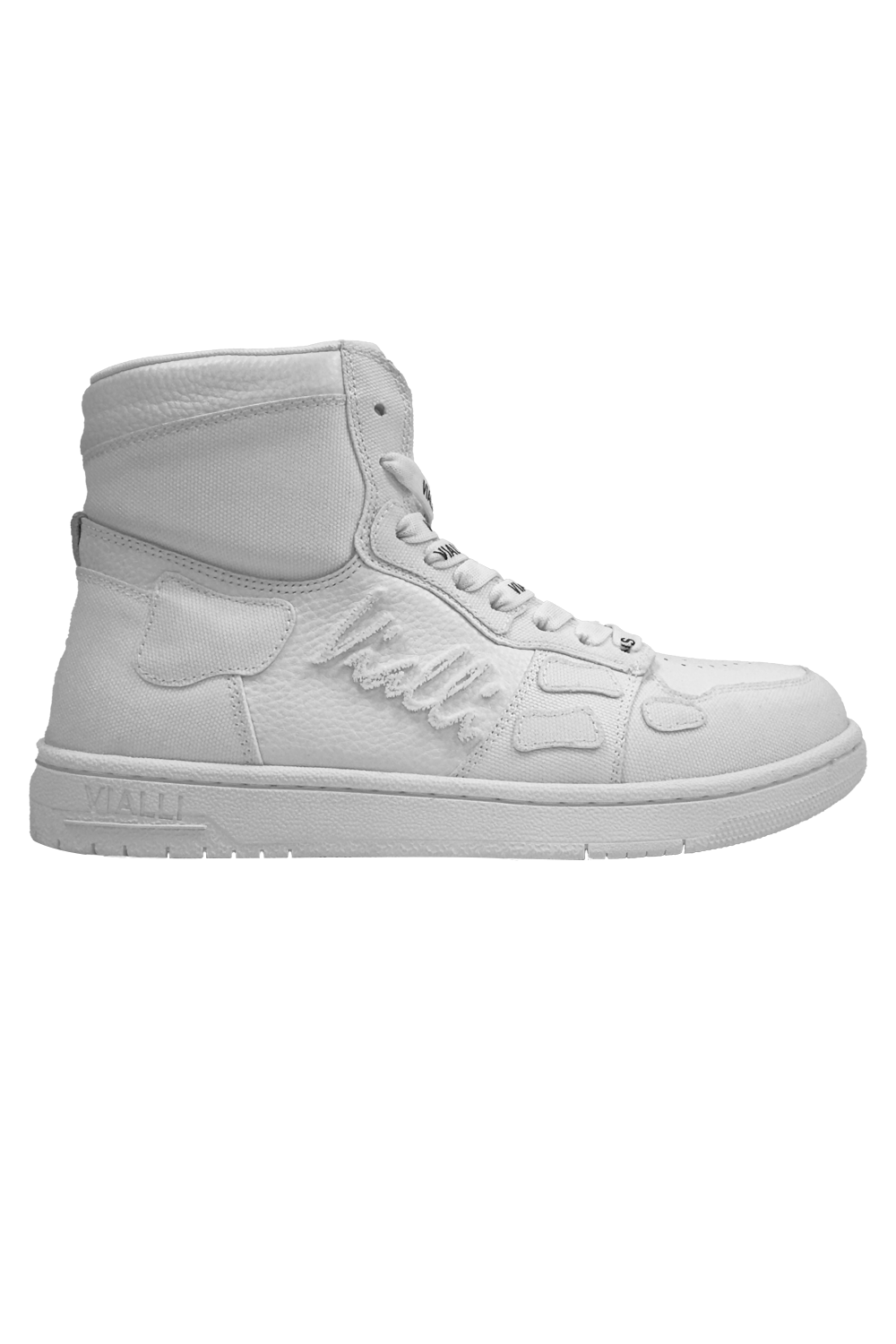 The Vialli Gallinari Mid Boot in white is a sleek and stylish lace-up sneaker boot. With its unique shades of grey, Vialli puff printing on the side, and branded lace, this boot is perfect for any fashion-forward individual. It also features a pull tab and intricately designed two-tone sole, adding both convenience and style. Make a bold statement with this must-have addition to your shoe collection.